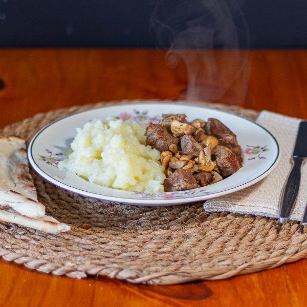 Cubos de lomo tiernos con una salsa cremosa de champignones frescos, acompañado de un puré de papas cremoso y suave.
