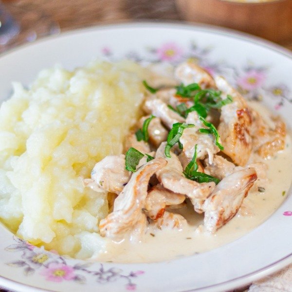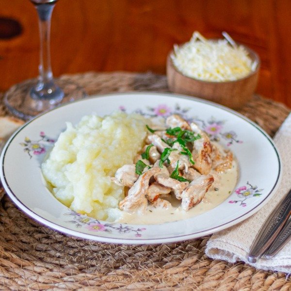 Pechuga de pollo en tiras con crema y verdeo, acompañada de un puré de papas suave y cremoso.