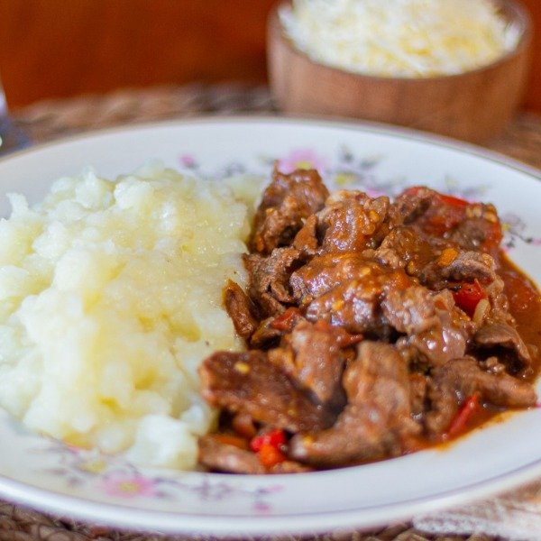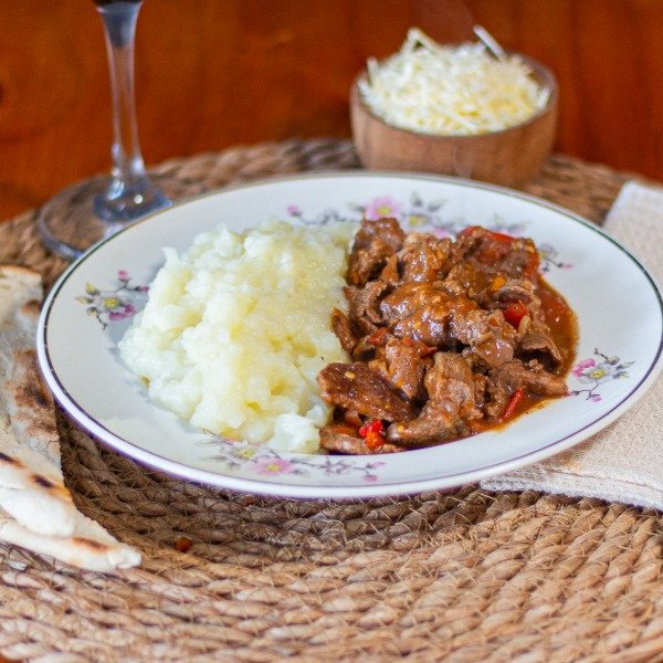 Ternera estofada cocinada a fuego lento con vegetales y condimentos. Acompañada con un puré de papas suave y cremoso.